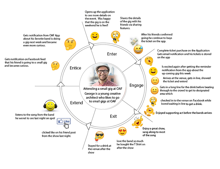 We then developed a user journey map of the personas to focus on their thoughts and feelings throughout the journey of attending the events to identify pain points throughout their process and identify the design opportunities for the solutions.